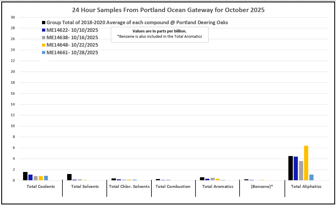 CAUTION to grab sampling data users: It is not appropriate to use grab sample data for any comparison to longer term average (e.g. annual) levels, guidelines or standards for health assessment purposes. Staff from the Maine Center for Disease Control (CDC) gave a presentation (PDF) to the South Portland City Council on November 26, 2019 that describes and illustrates their approach to interpreting this data from a health perspective. The grab sample data charts we’ve created here are intended to simply be a visualization of each sample’s results from an air quality perspective, comparing them to the 2018 annual averages from our Portland Deering Oaks site, which for this purpose are being used as reference or background concentrations for the area.